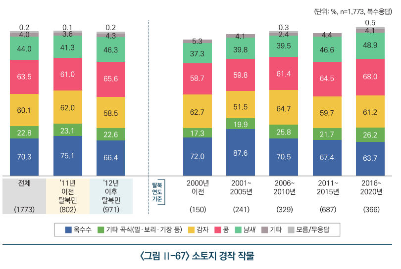 협동농장 재배작물 중 곡물은 옥수수가 가장 많았고 채 소는 배추와 무가 다수를 차지함