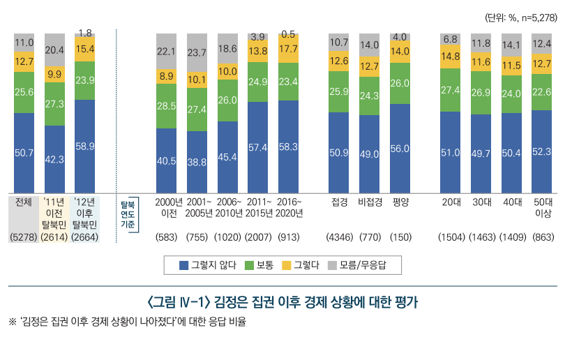 북한 주민들은 김정은 정권의 경제 ·사회 정책에 대해 부정적 태도가 강했다. 김정은 집권 이후 경제와 인심이 좋아졌다고 평가한 비율은 10% 초반대 로 소수였으며 김정은 정권이 강성국가를 달성했다고 평가한 비율 역시 10% 미 만이었다.