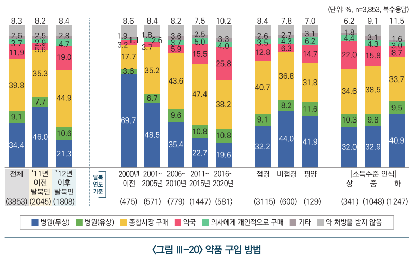 북한 주민들은 종합시장 에서의 경제활동을 통해 생활을 꾸려가고 있다. 종합시장의 영향력은 의식주, 에 너지, 상하수도 등의 일상생활과 더불어 보건의료, 교육, 교통, 정보 인프라 영역 으로까지 확장되고 있다