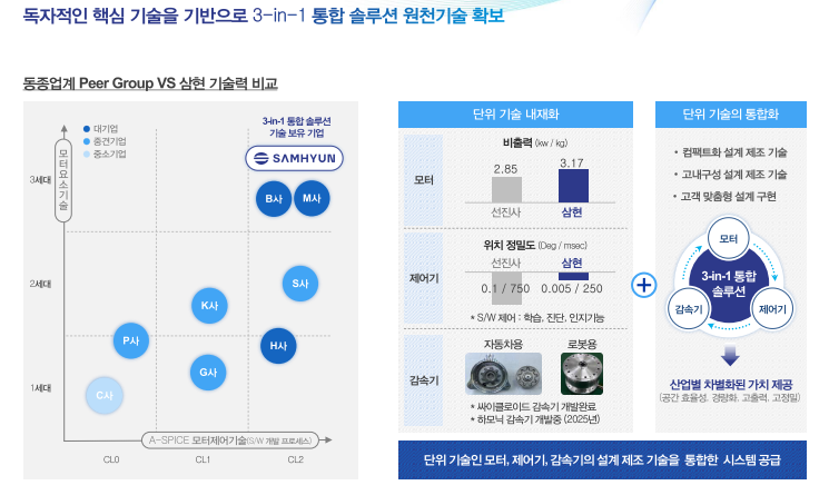 동사는 모터, 감속기의 기구 및 정밀 제어가 가능한 제어기 '통합화(Integration)' 기술을 보유하여,