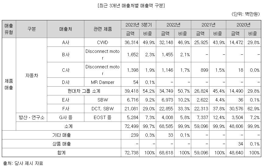 현대차 그룹으로 신규 납품되어 현대차 그룹으로 직접 납품되는 매출액이 늘어나고 있는 추세입니다.