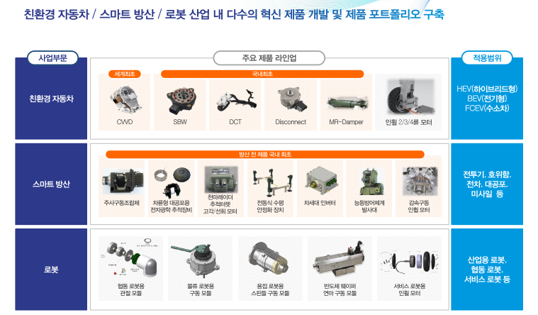 무인화 방산의 경우, 사는 전기식 수평 잭시스템, 구동모터 등 다양한 체계개발 및 수주 실적을 달성하고 있습니다.