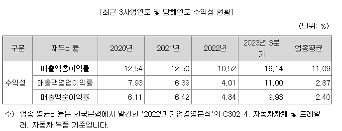 동사의 순이익률은 2020년 6.11%, 2021년 6.42%, 2022년 4.84%, 2023년 3분기 9.93%을 기록하였습니다.
