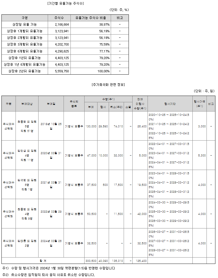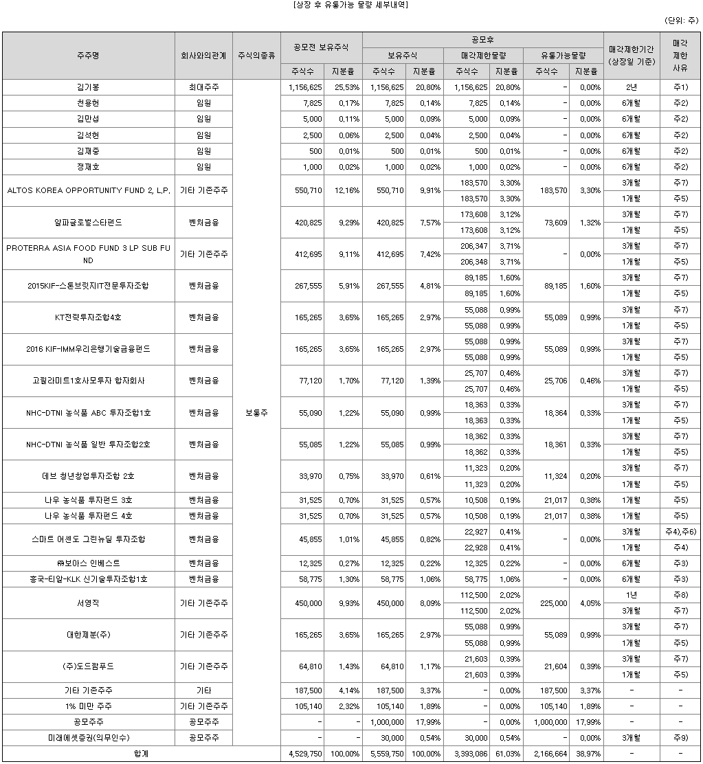상장 예정 주식수는 5,559,750주이며 이중 3,393,086주는 보호예수가 있고 2,166,66주는 상장 당일 풀릴 수도 있다.